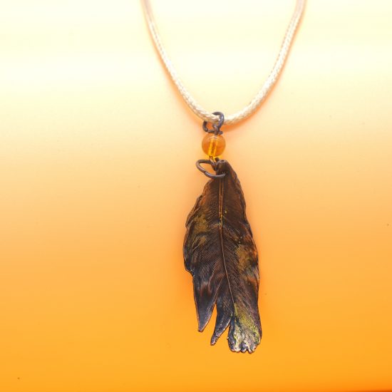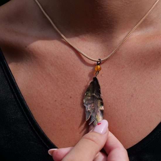 Federleicht und einzigartig!In edlem Kupfer erhaltene und farblich in dezenten Farben abgerundete Feder als Halsanhänger für den Ausdruck eigener Einzigartigkeit. Eine Wiederholung gibt es nicht...genauso wie in der Natur. Getragen wird der Anhänger an einem passenden Baumwollband, das das Gesamtbild abrundet. Für alle, die das Wechselspiel von Natur und Seele spüren – und die Schönheit des Unvollkommenen schätzen. Details: • Anhänger: ca. 2,5 × 2,5 cm • Gewicht: ca. 4 g • Kette: Baumwollband (gewachst), ca. 45 cm 🍂 organisches Ausgangsmaterial – jedes Stück ein Unikat 🌱 nachhaltig – u.a. Altkupfer als Rohstoff 💚 handgefertigt in Deutschland