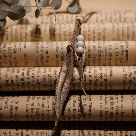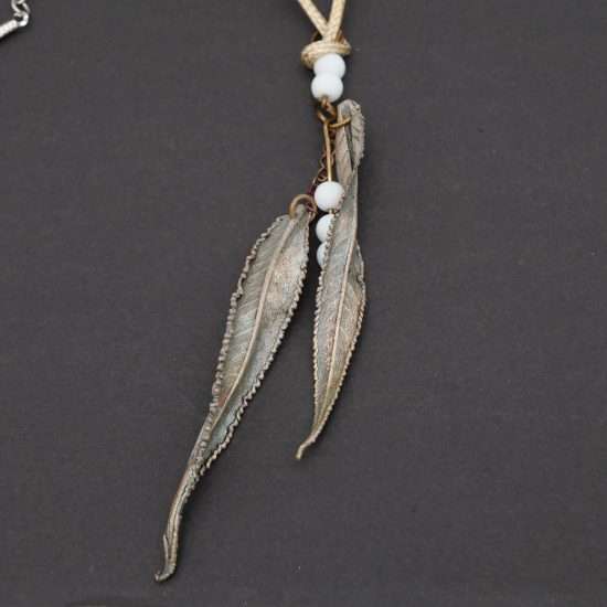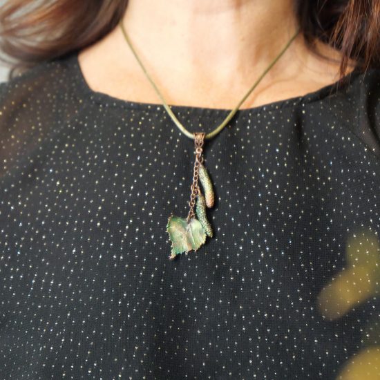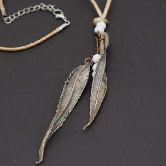 Ein Weidenblattpärchen - füreinander geschaffen! Zarte echte Weidenblättchen liebevoll erhalten in Kupfer...leicht und unzertrennlich... Eine dezente und edle Kupferpatina und weiße Jade Perlen verleihen dem Schmuckstück eine natürliche und gleichzeitig eine verspielte Ausstrahlung. Getragen wird der Anhänger an einem passenden Baumwollband, das das Gesamtbild abrundet. Für alle, die das Wechselspiel von Natur und Seele spüren – und die Schönheit des Unvollkommenen schätzen. Details:• Anhänger: ca. 2 × 11 cm, Blatt ca. 8 cm lang• Gewicht: ca. 4 g• Kette: Baumwollband gewachst, ca. 45 cm 🍂 organisches Ausgangsmaterial – jedes Stück ein Unikat 🌱 nachhaltig – u.a. Altkupfer als Rohstoff 💚 handgefertigt in Deutschland59,00 € -