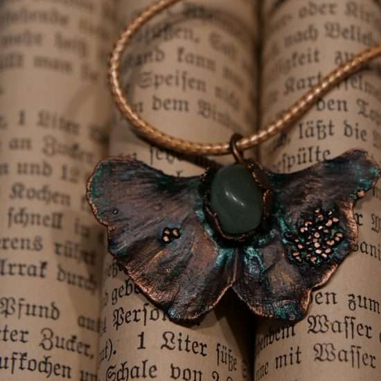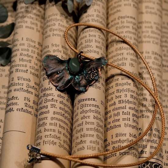 Ein Blatt wie ein verspielter Schmetterling! Filigranes echtes Blatt, erhalten in allen Details in Kupfer: leicht und stimmungsvoll! Eine Geschichte voller Abenteuer, erzählt von einem warmen Edelmetall. Ein sanft schimmernder Aventurinquarz betont den Ausdruck von Lebensfreude und Zärtlichkeit! Getragen wird der Anhänger an einem passenden Baumwollband (ca. 45 cm), das das Gesamtbild abrundet. Für alle, die das Wechselspiel von Natur und Seele spüren – und die Schönheit des Unvollkommenen schätzen. Details: • Anhänger: ca. 4,5 × 2,5 cm • Gewicht: ca. 4 g • Kette: Baumwollband (gewachst, ca. 45 cm.) • Edelstein: Aventurinquarz 🍂 organisches Ausgangsmaterial – jedes Stück ein Unikat 🌱 nachhaltig – u.a. Altkupfer als Rohstoff 💚 handgefertigt in Deutschland54,00 €