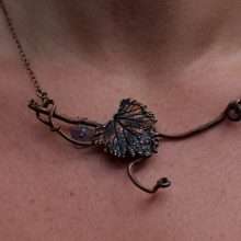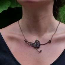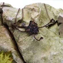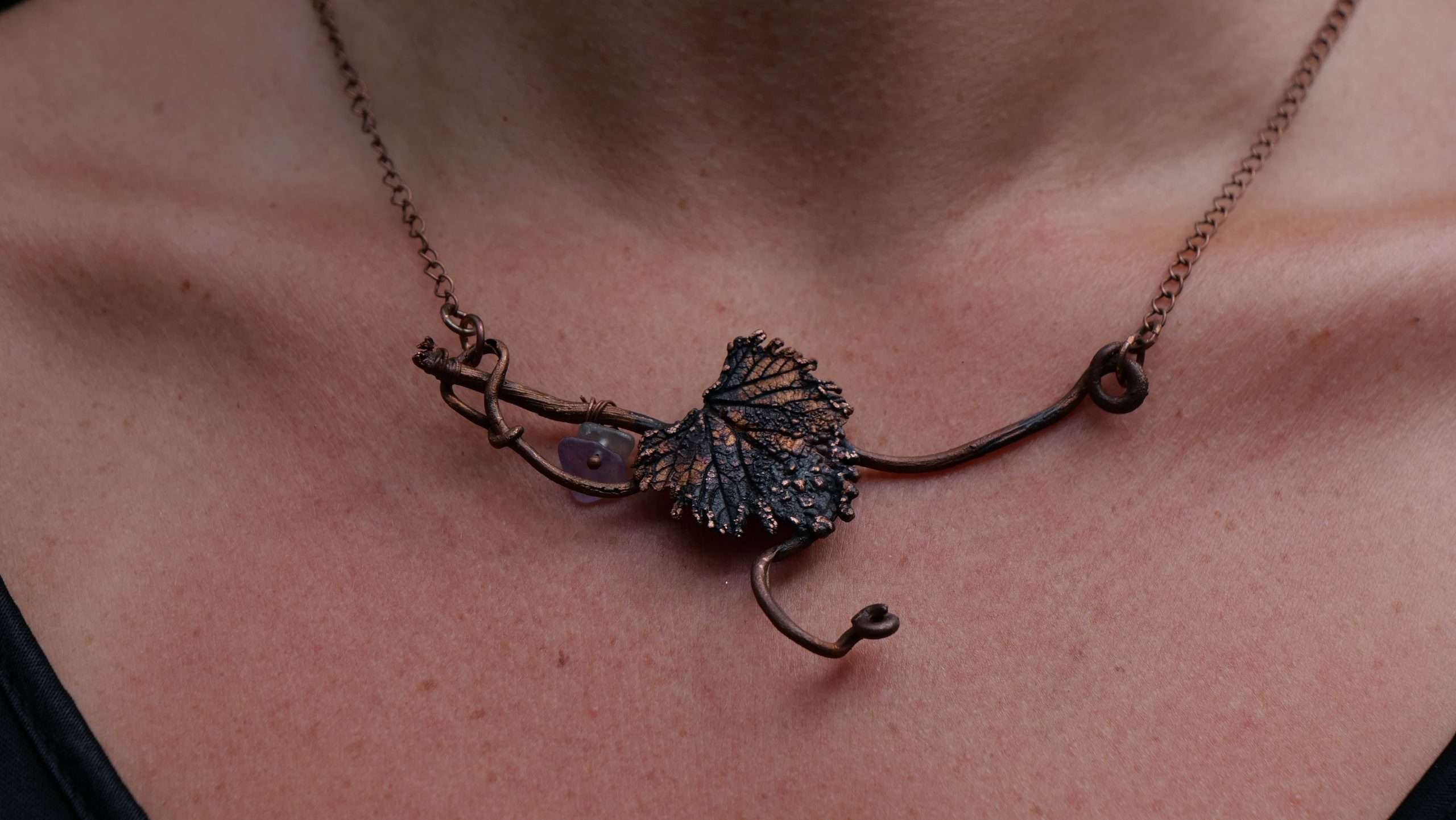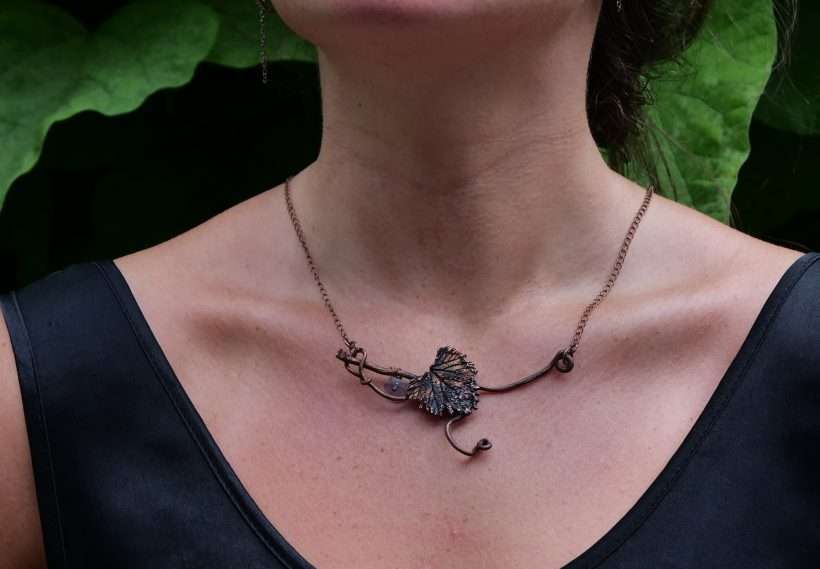 Vollendet wird das Schmuckstück durch dezente und funkelnde Steine, eine passende Metallkette in warmem Kupferton und Akzente einer Naturpatina, die das edle Metall betont.