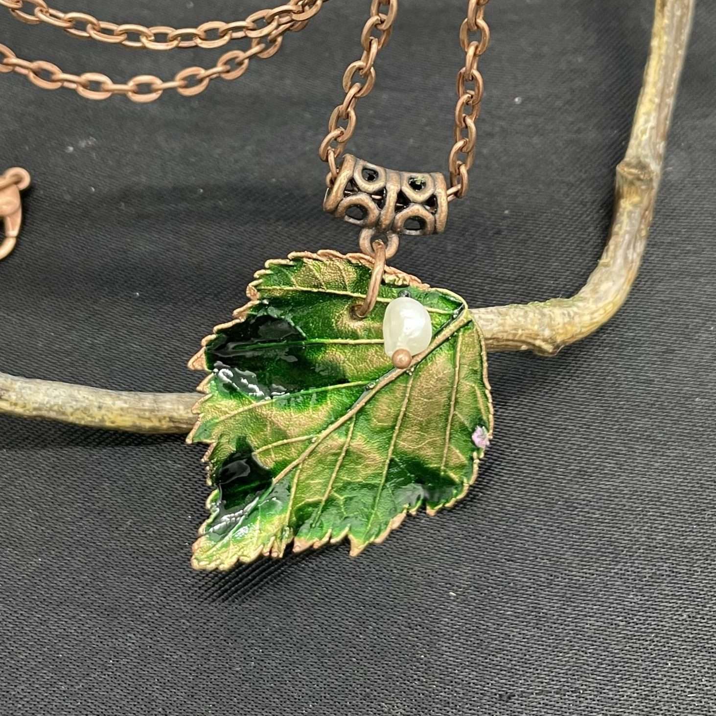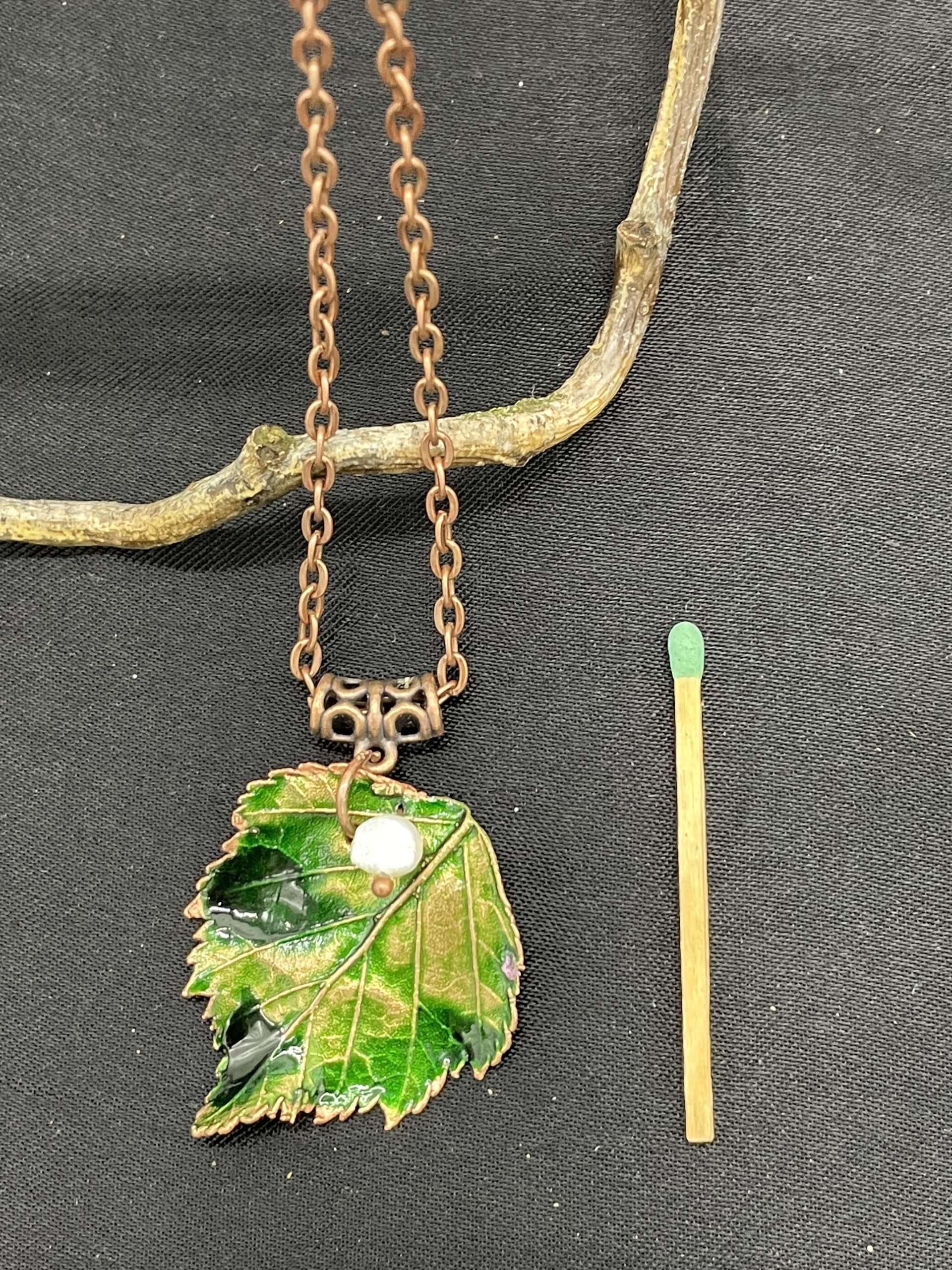 Ein echtes Birkenblatt, verkupfert und mit zarten Akzenten handbemalt. Die natürliche Form und Struktur des Birkenblattes bleiben erhalten. Besonders, wie jedes Blatt in der Natur.