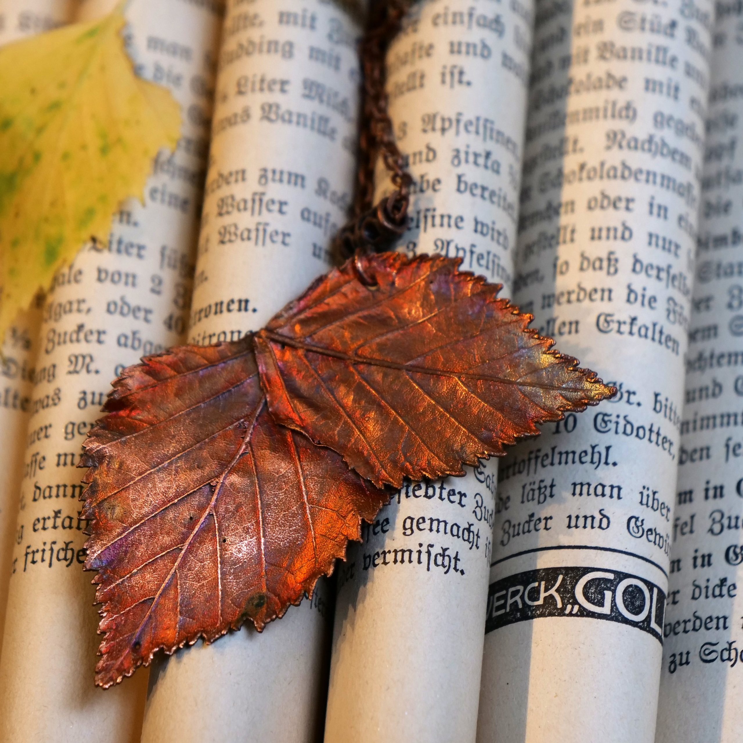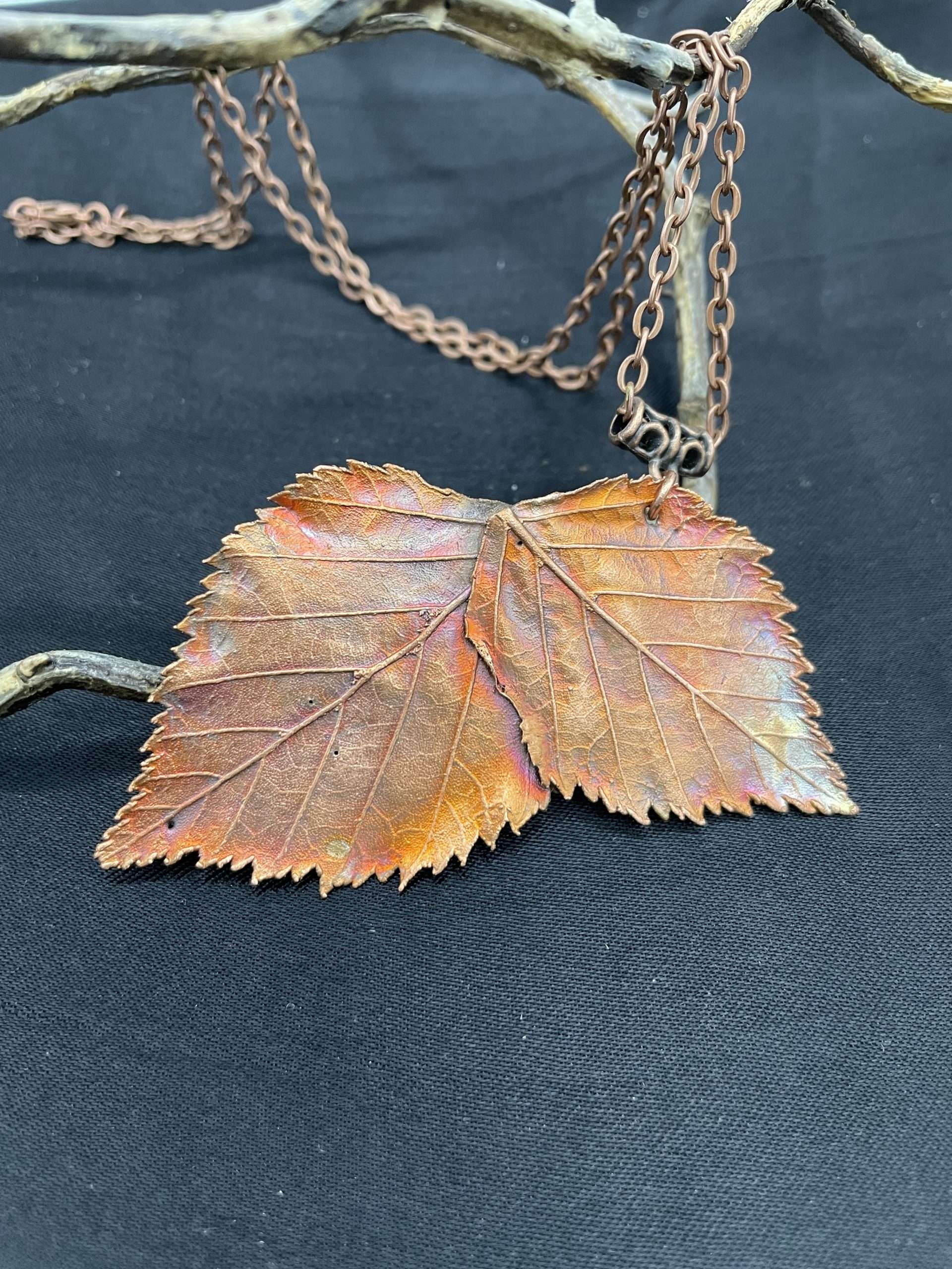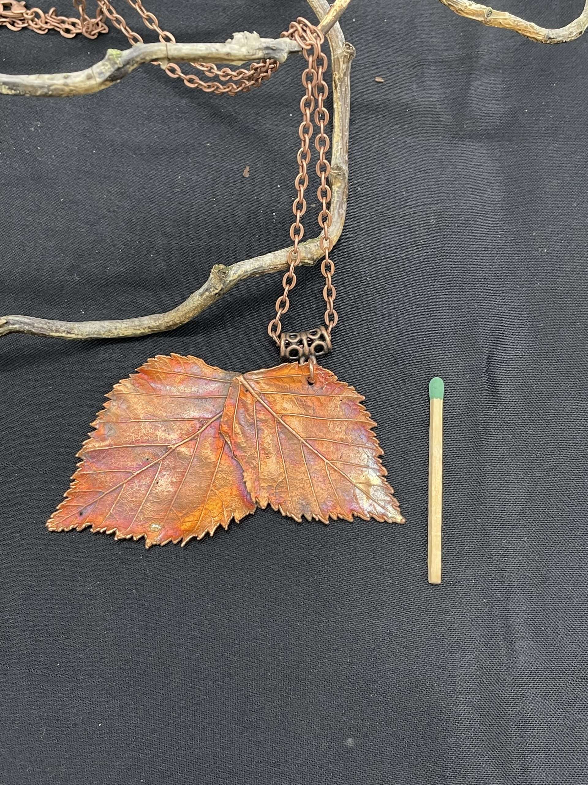 ein Birkenblattpärchen, liebevoll ausgesucht, verkupfert und „feuerbemalt“! Das ist möglich durch die natürliche Eigenschaft des Kupfers in wundervollsten Farbkombinationen zu oxidieren! Es ist keine Behandlung mit Metallschutz erfolgt, um einen möglichst ungestörten Kontakt zur Haut zu ermöglichen: für die, die die besonderen Eigenschaften von Kupfer spüren wollen!