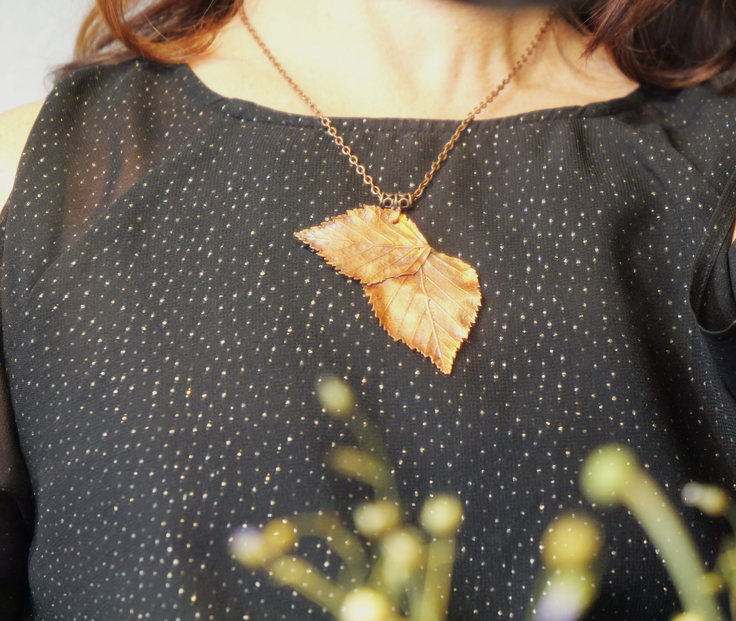 Getragen wird der Anhänger an einer passenden Metallkette in Kupfer, die das Gesamtbild abrundet.