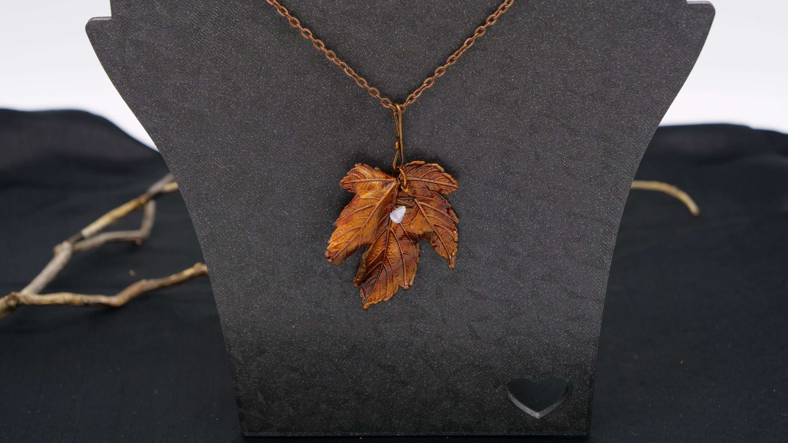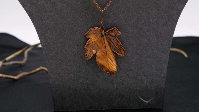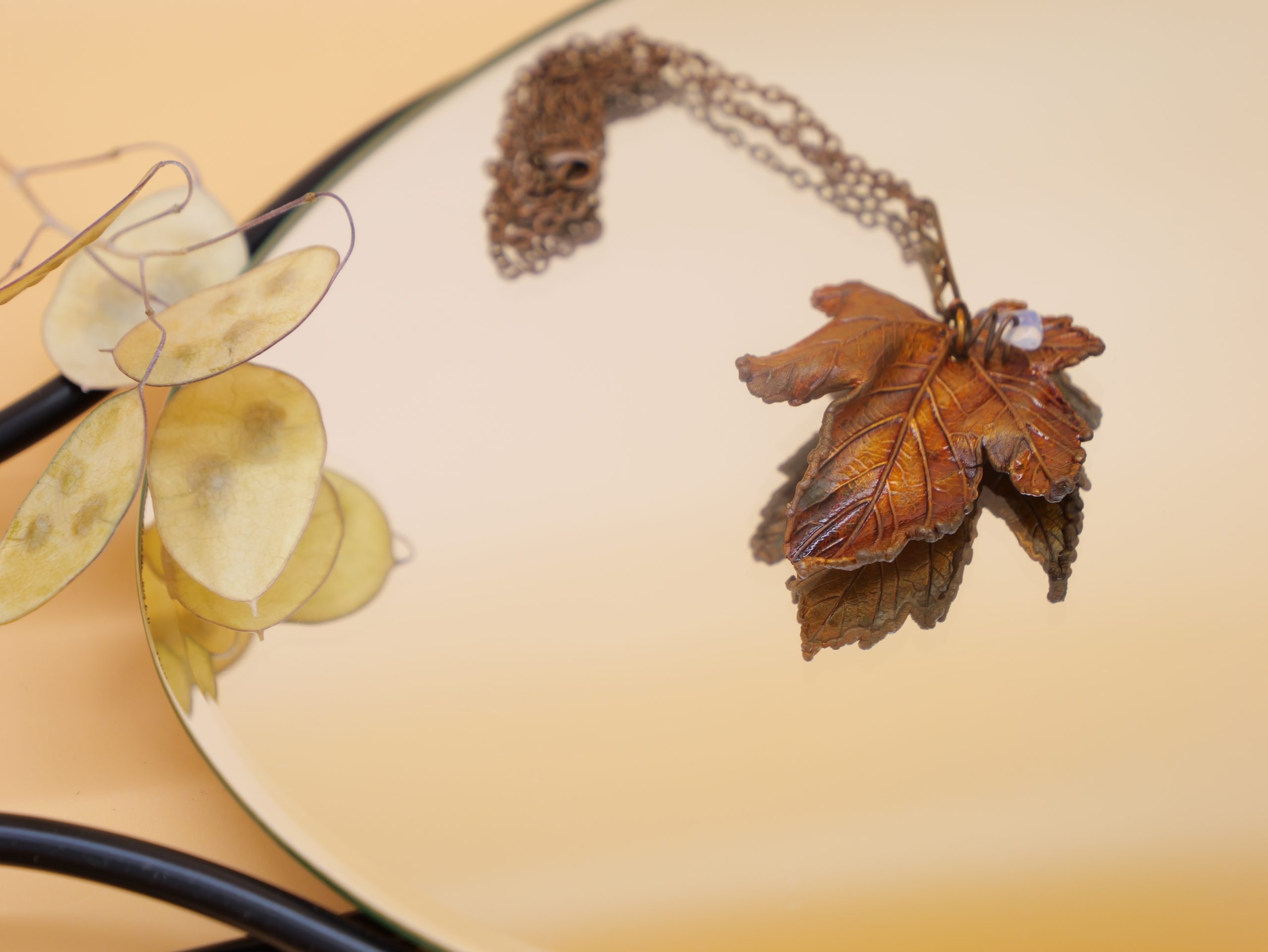 Die warme Kupferfarbe verleiht dem Blatt eine edle, leicht glänzende Oberfläche, die sich angenehm tragen lässt – als Schmuckstück mit Geschichte.
