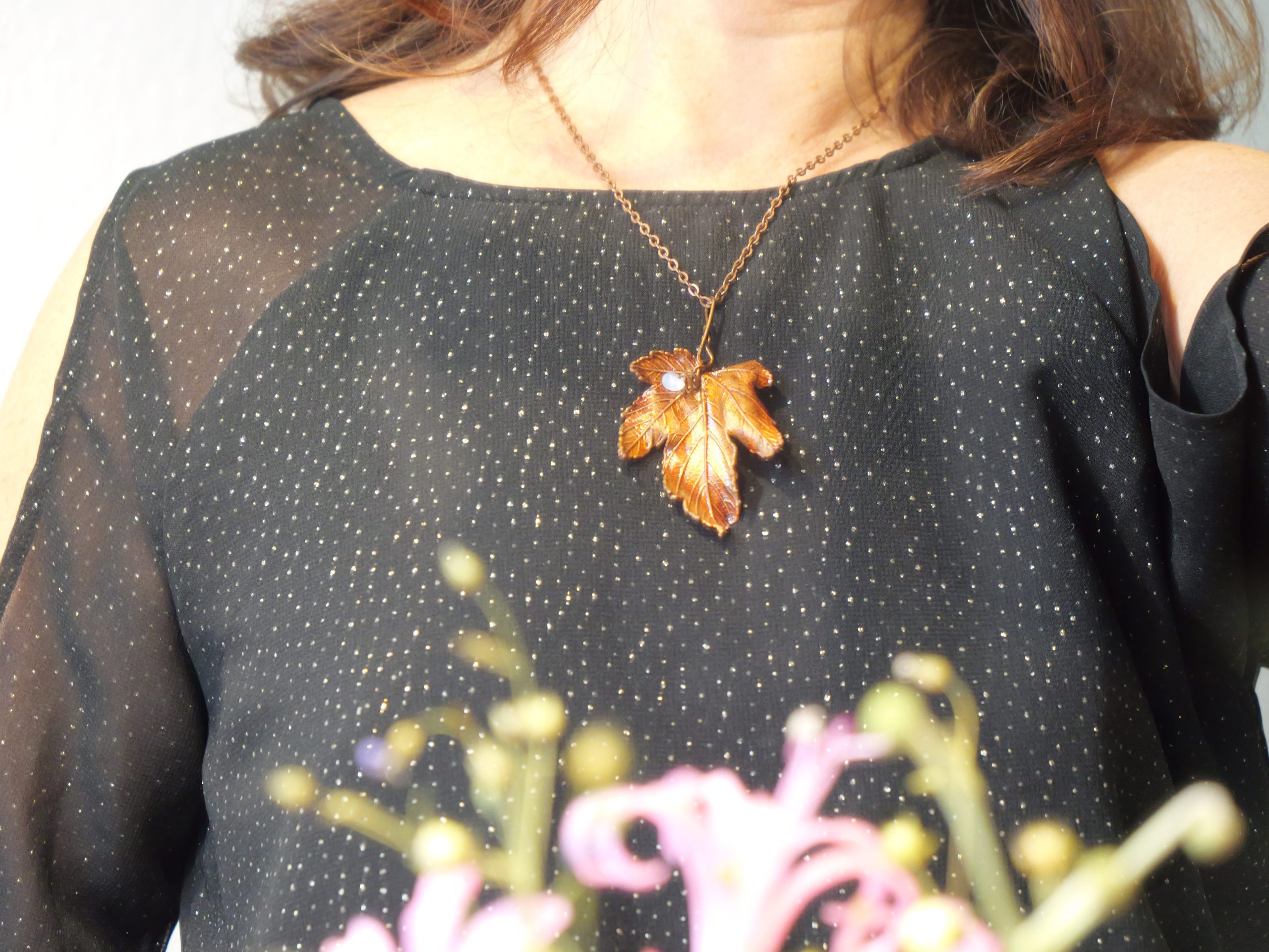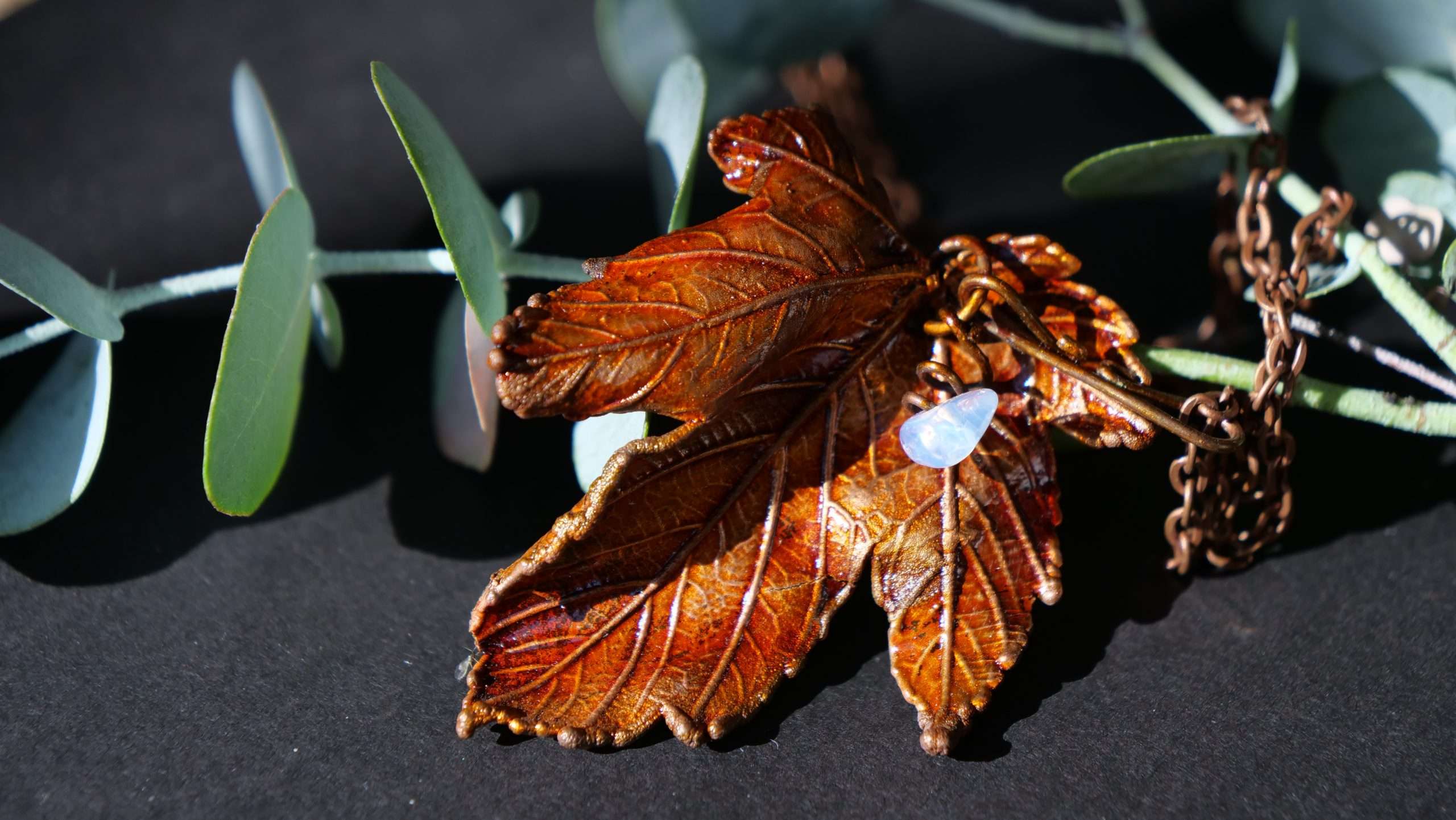 Getragen wird das verkupferte Blatt an einer passenden Metallkette in Kupfer. Ein kleiner Mondstein setzt einen dezenten Akzent und rundet das Design elegant ab. Beidseitig tragbar.