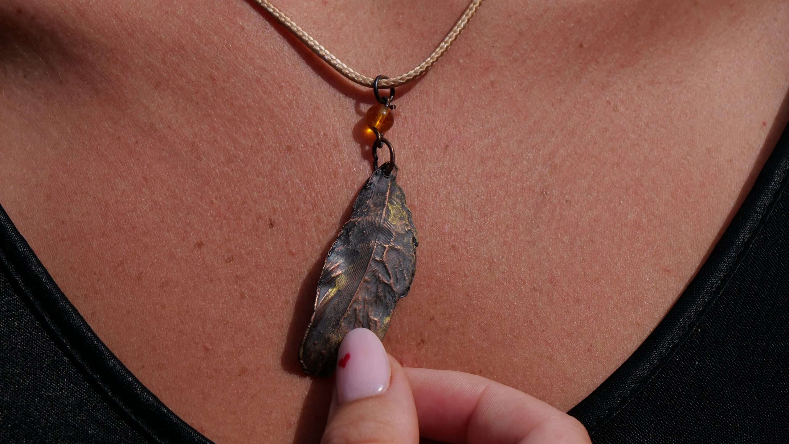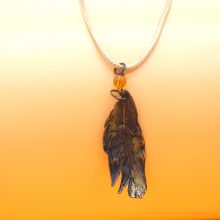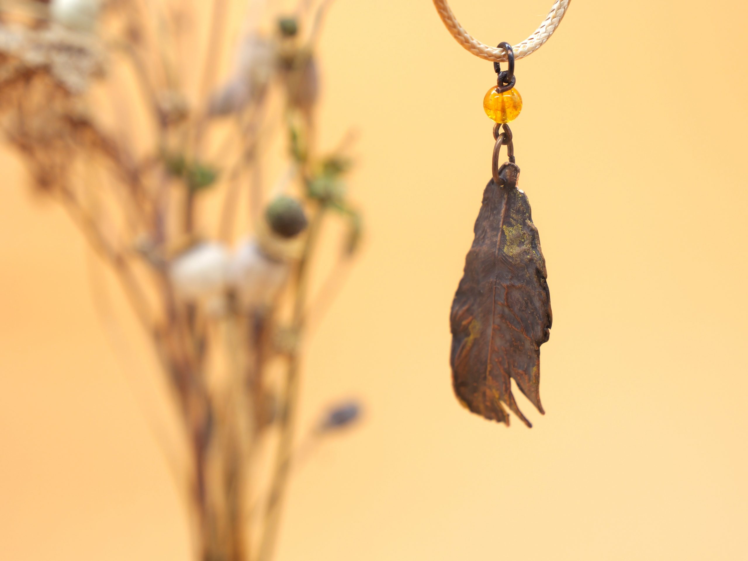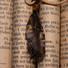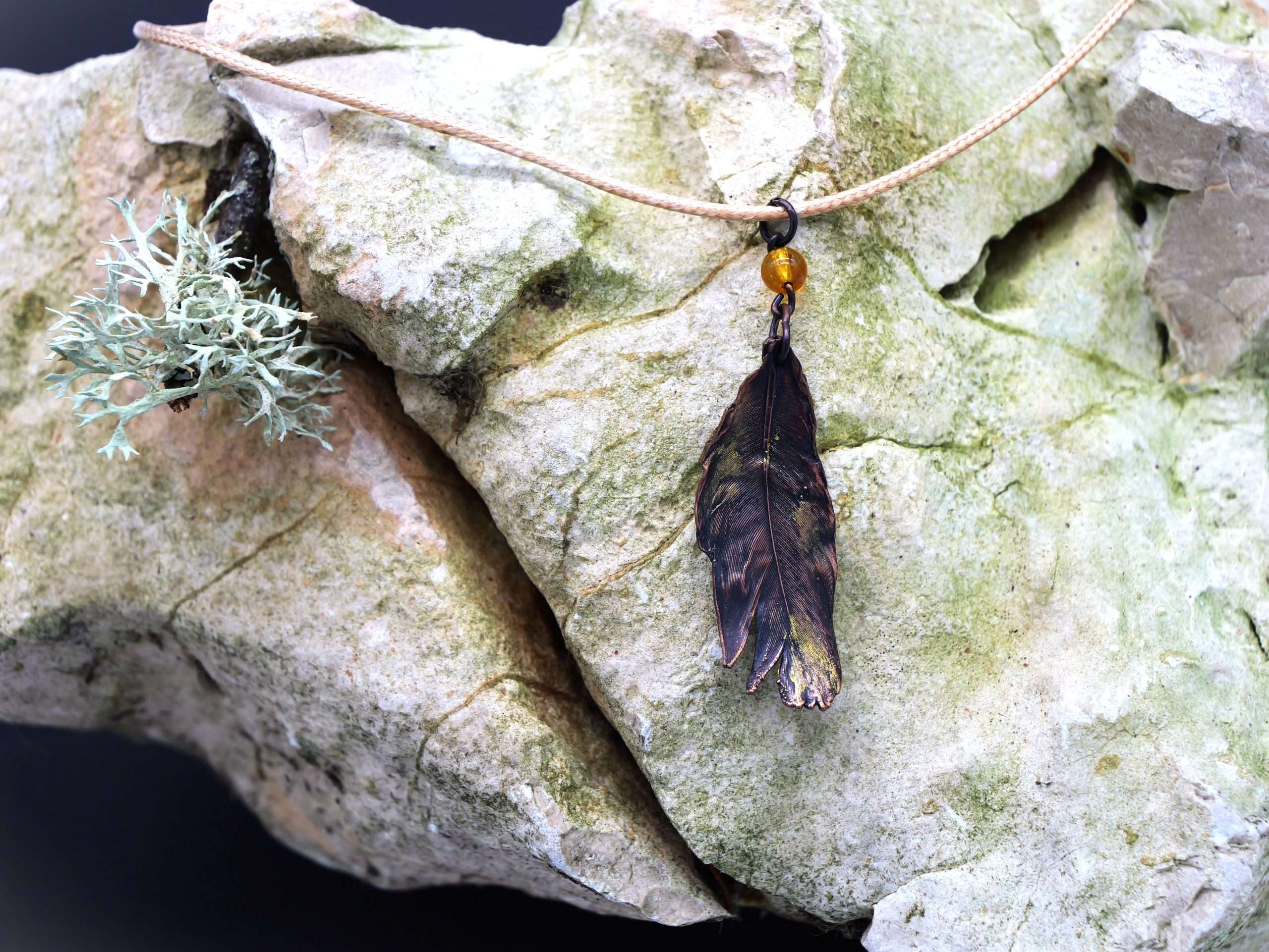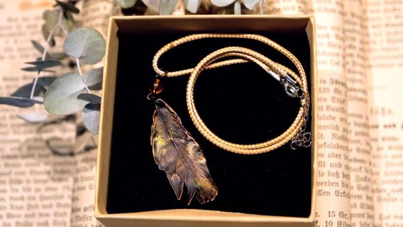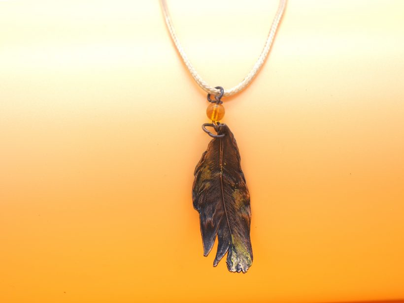 In edlem Kupfer erhaltene und farblich in dezenten Farben abgerundete Feder als Halsanhänger für den Ausdruck eigener Einzigartigkeit. Eine Wiederholung gibt es nicht…genauso wie in der Natur.