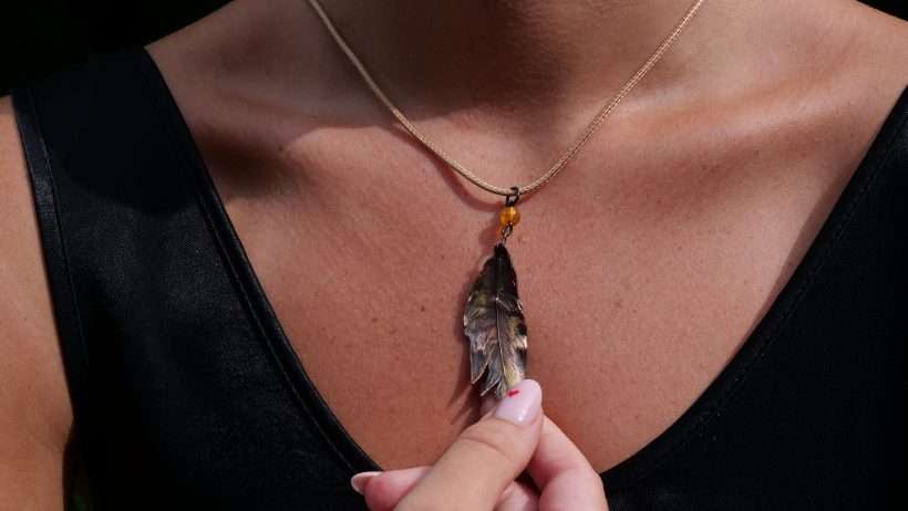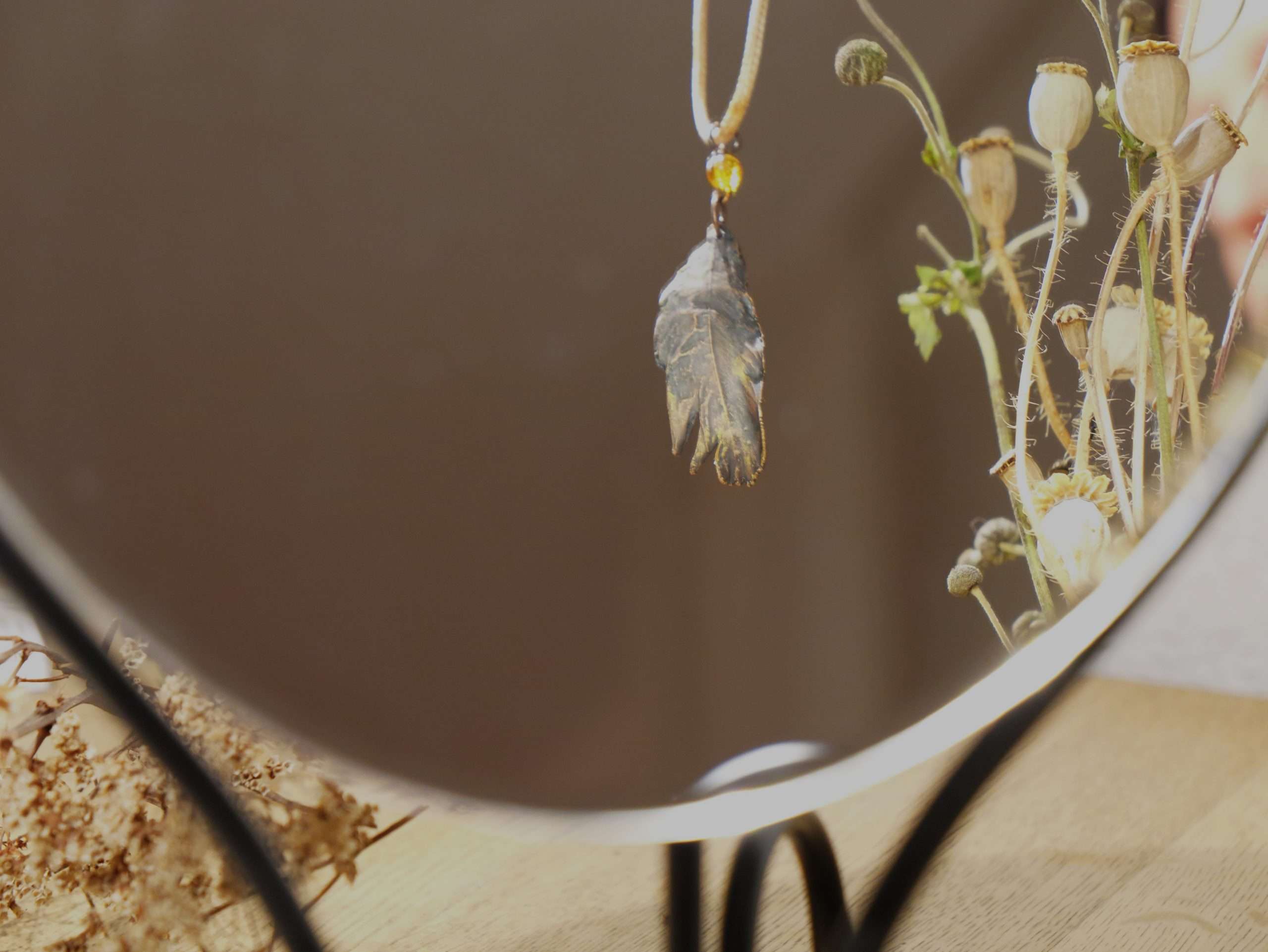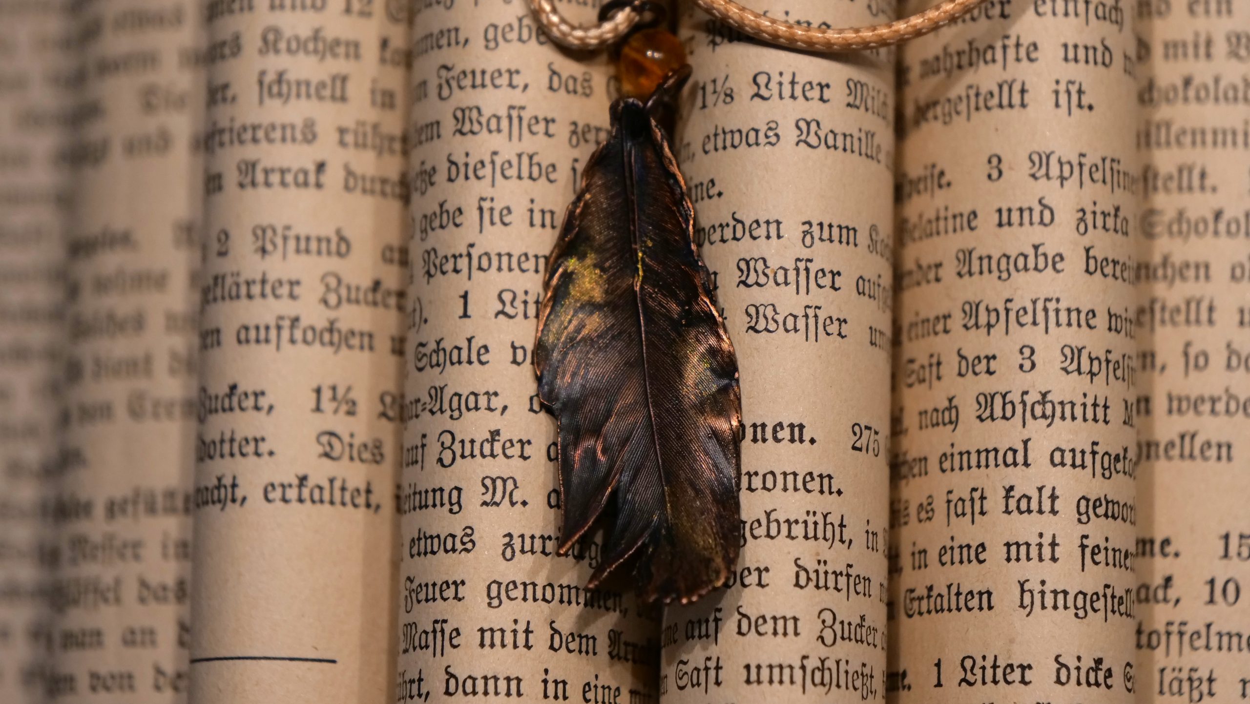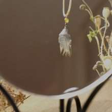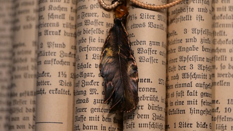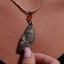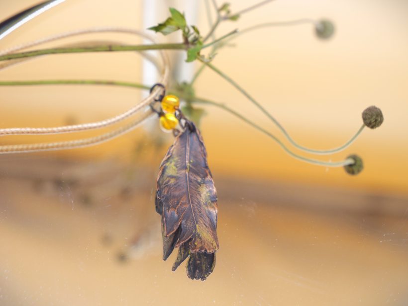 In edlem Kupfer erhaltene und farblich in dezenten Farben abgerundete Feder als Halsanhänger für den Ausdruck eigener Einzigartigkeit. Eine Wiederholung gibt es nicht…genauso wie in der Natur.